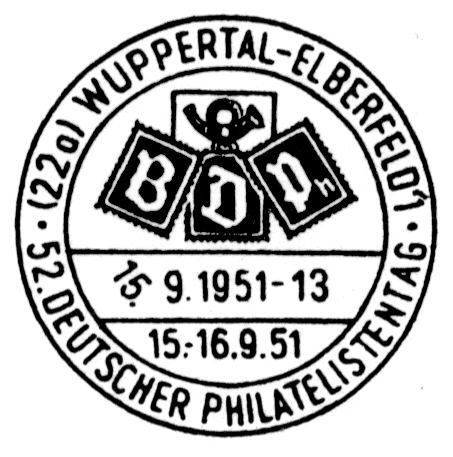 (22a) Wuppertal-Elberfeld 1 | 52. Deutscher Philatelistentag 15.-16.9.51 | 15.09.-16.09.51 | |||||||||